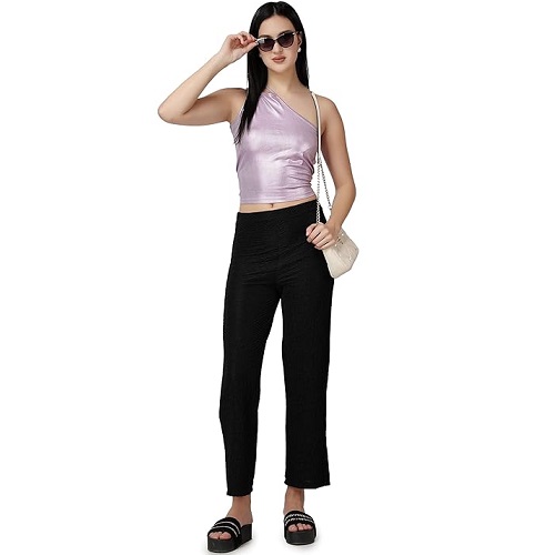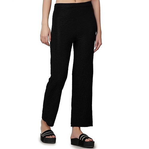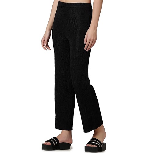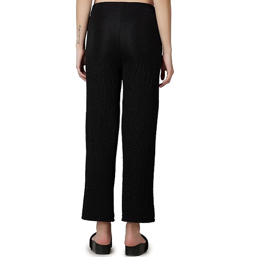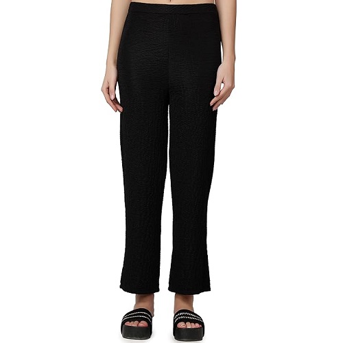 Casual Black Solid Self Design Relaxed Straight Fit Flat-Front Women Pants