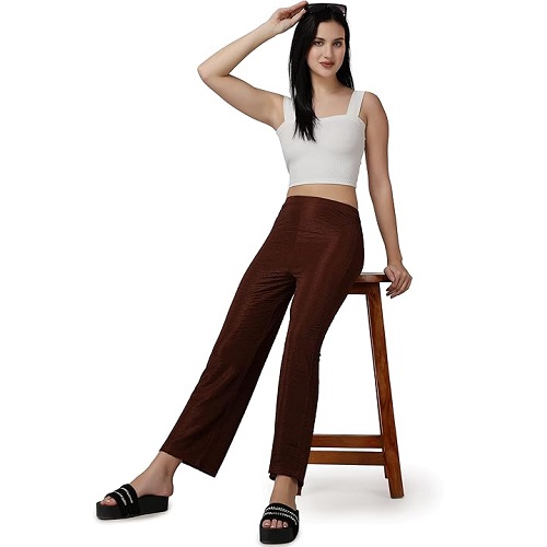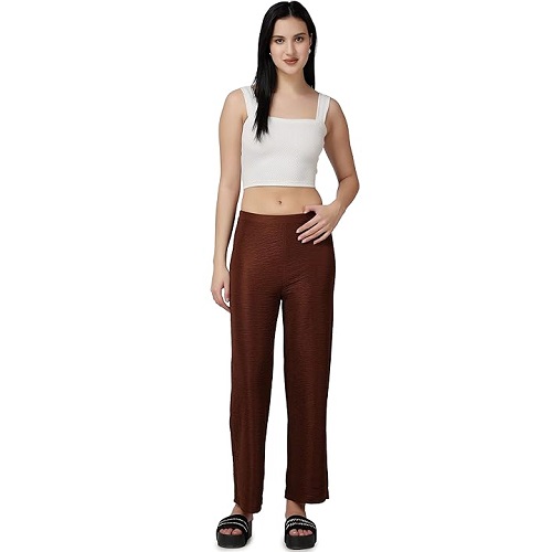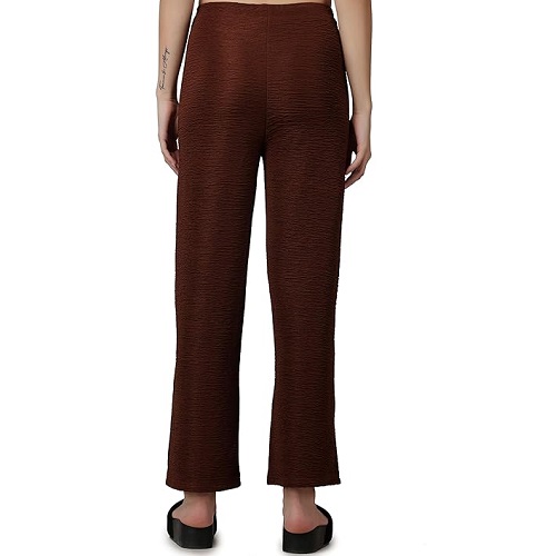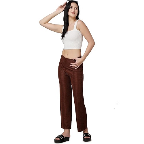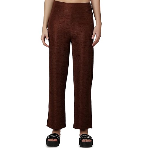 Casual Brown Solid Self Design Relaxed Straight Fit Flat-Front Women Pants