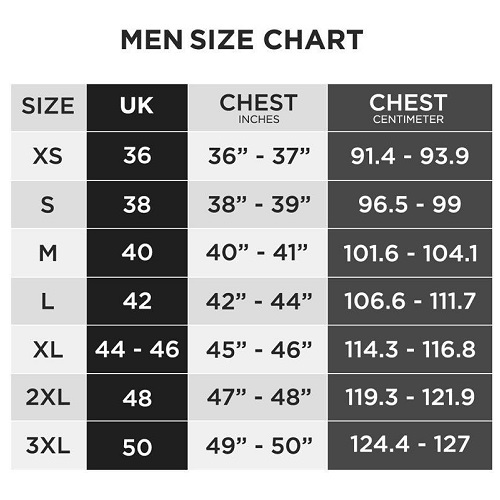 Size chart – XS-36, S-38, M-40, L-42, XL-44, XXL-46 XXXl-48