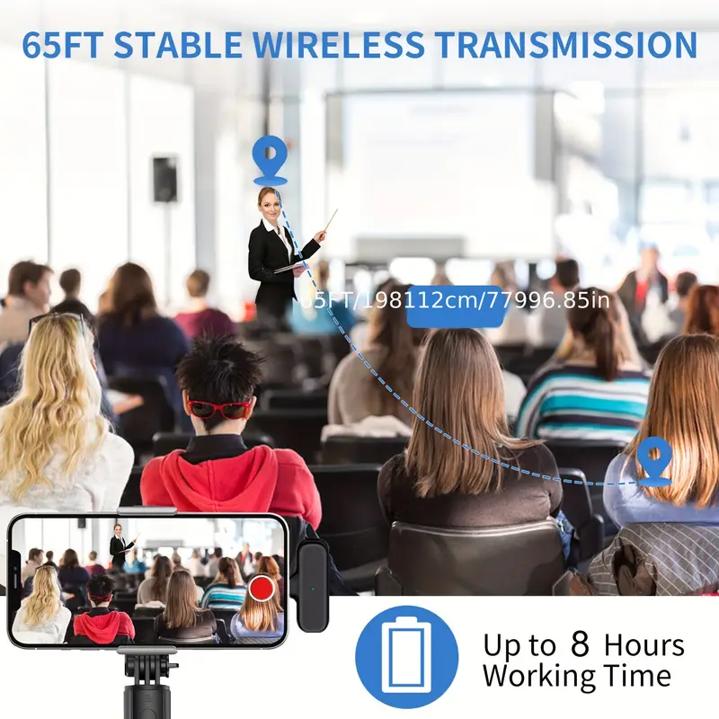 - wireless lavalier microphones is built in rechargeable batteries, each wireless microphone can be used for up to 8 hours after about 1-2 hours charging. Easy to connect and Transmission Distance about 65FT for signal and using real-time auto-sync technology, helps you reduce trouble and clearly recording or taking video at a further distance.